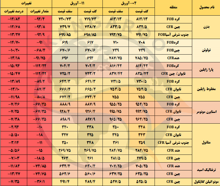 تغییر قیمت جهانی مواد شیمیایی منتهی به 11 آپریل 2025